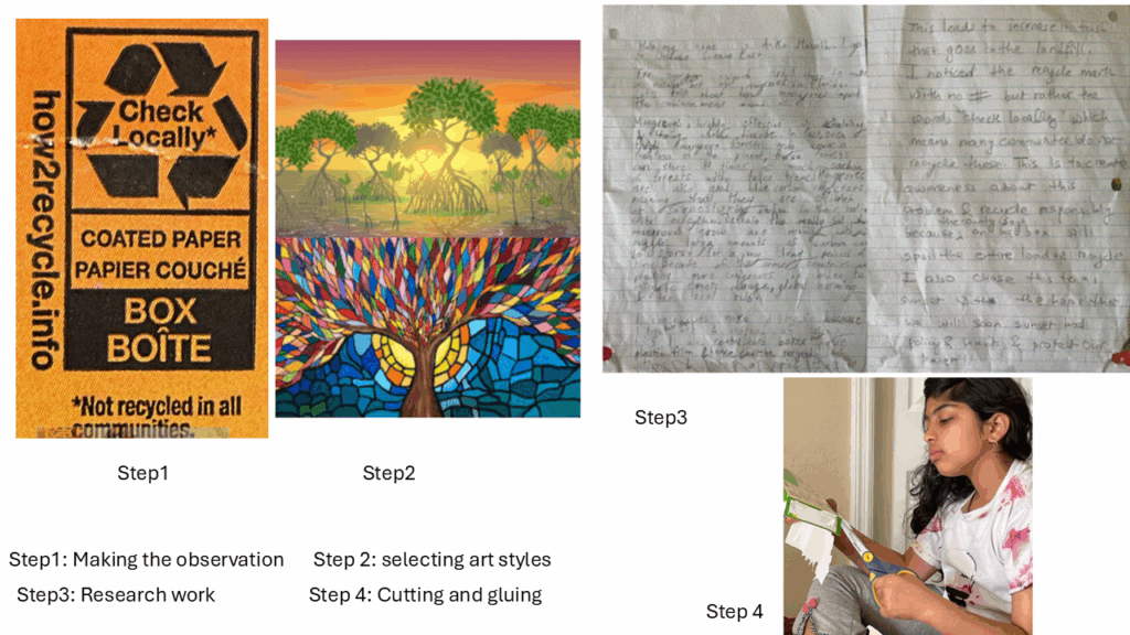 Step2: I then researched information about why coated board boxes were not recycled and why is it important to sort the recycle. I looked up how to do mosaic art and also why mangroves. You might wonder how are slimy muddy waters of mangroves related to climate change? Well, in addition to fixing carbon dioxide like other plants do, mangroves also hold 10 times the carbon in the muddy roots and soil. The dense roots and marshes where mangroves grow does not contain oxygen. Thus, the carbon stays as carbon. For this reason, they are also called as blue carbon collectors, because they sequester carbon in their native ecosystem. This can really fight global warming and climate change and some countries are planting more mangroves to purify the environment. (Artifact 2)
