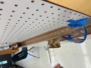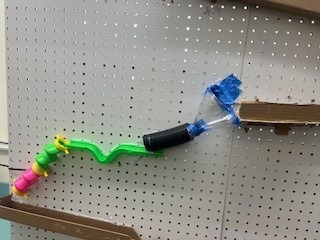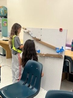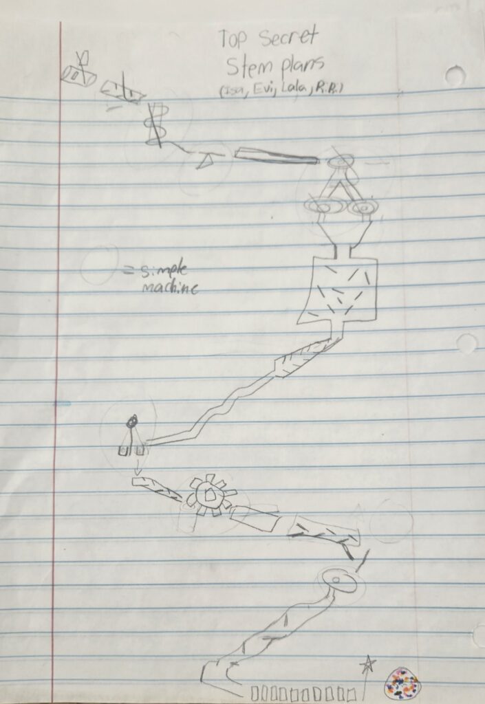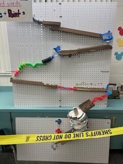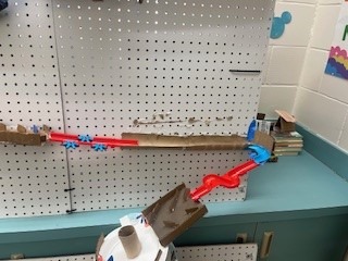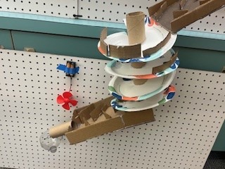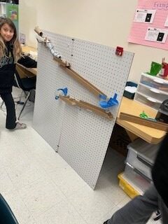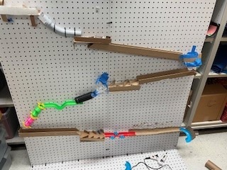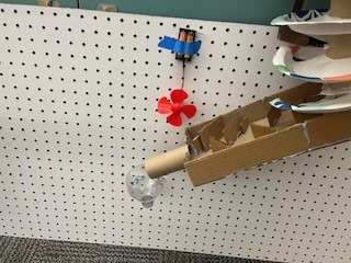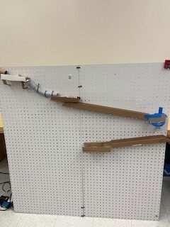 First, the marble will be released by pulling the lever. The marble will roll down the inclined maze into the PVC pipe. It then travels down a long inclined plane. Next, it will go to the funnel which brings the marble to a new inclined plan, then a new maze. After the mazee, the marble will go to a new funnel. When the marble c come out of the maze, it will continue down a tunnel, then to an inclined plane with a “speed bump.” The marble will then travel into the zig-zag pipe and down another inclined plane. Next, the marble travels through a new maze into an inclined plane with gears. After the gears, the marble continues traveling down an inclined plane to the zig-zag inclined plane. The marble will move throuth a maze that leads to the corkscew. Then, it will enter a new maze. Finally, with the help of the motor, the marble will go through the funnel and hit the see-saw which knocks over the cup full of confetti!
