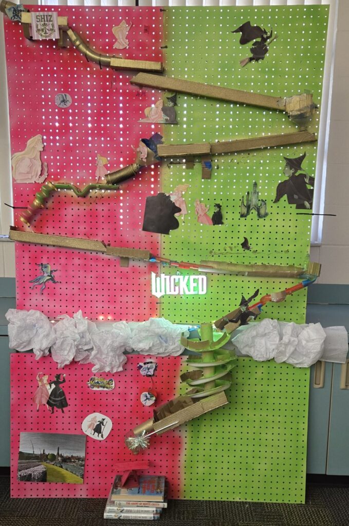 Wicked shows the energy transfer run as Elphaba is making her way to Galinda by following the Yellow Brick Road through the maze of tunnels and corkscrews. They are finally reunited at MunchkinLand and celebrate their friendship with an explosion of confetti!