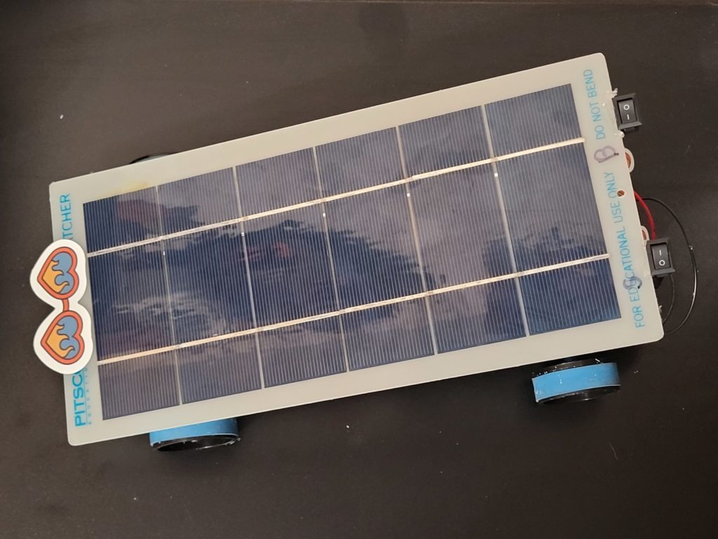 The wires were taken off and reconnected with power switches to control the solar panel or the batteries. We cut the sides to add to the car and added the stickers. We also watched a video on gear ratio and building solar cars.