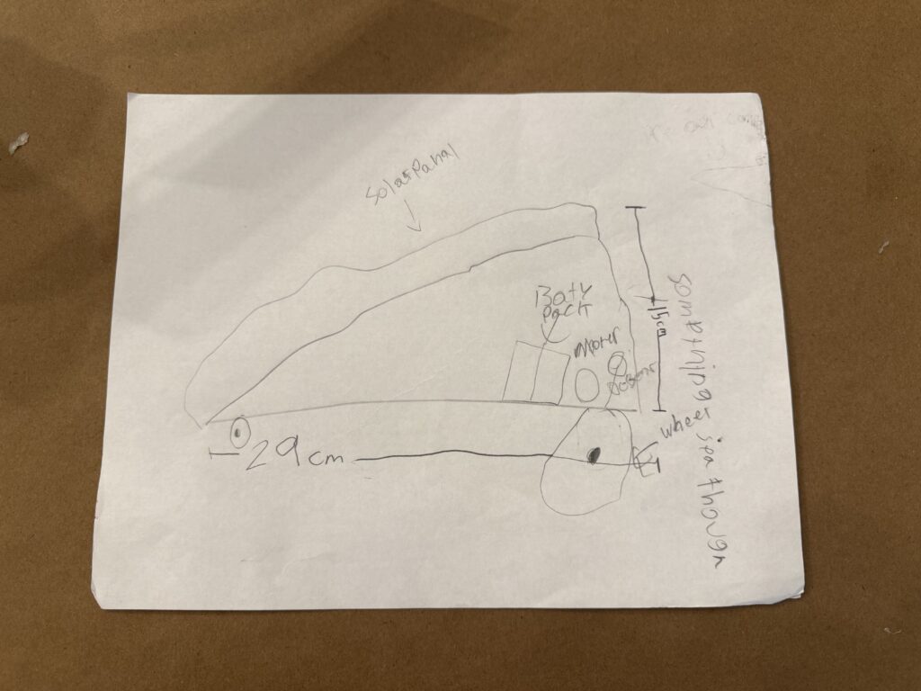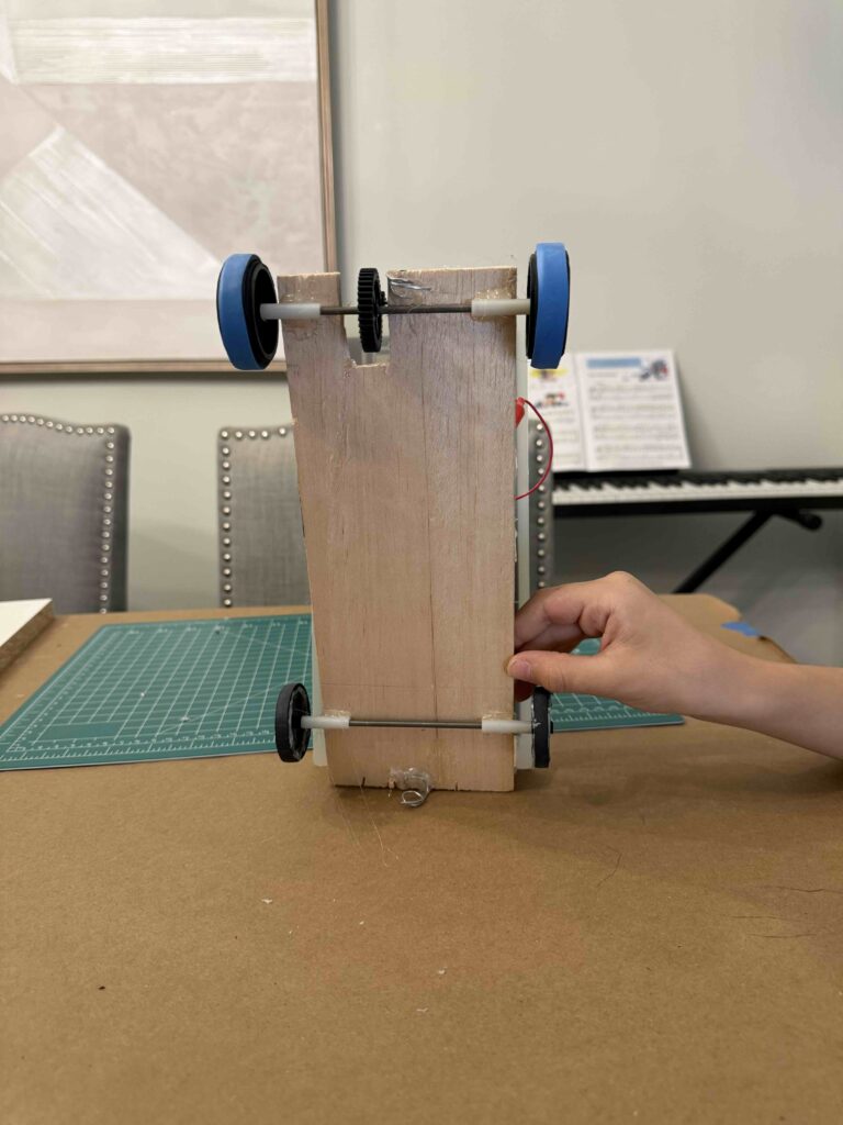 Based on the designs sketched by the team during their last meeting, the team constructed their solar car. Gear size ratios were discussed and the team felt that the gear option that provided a mix of both stability and speed was the one they were going to use (10-toothed gear on the motor and 20-toothed gear on the axle).