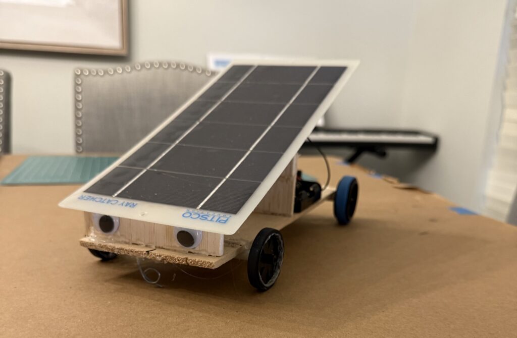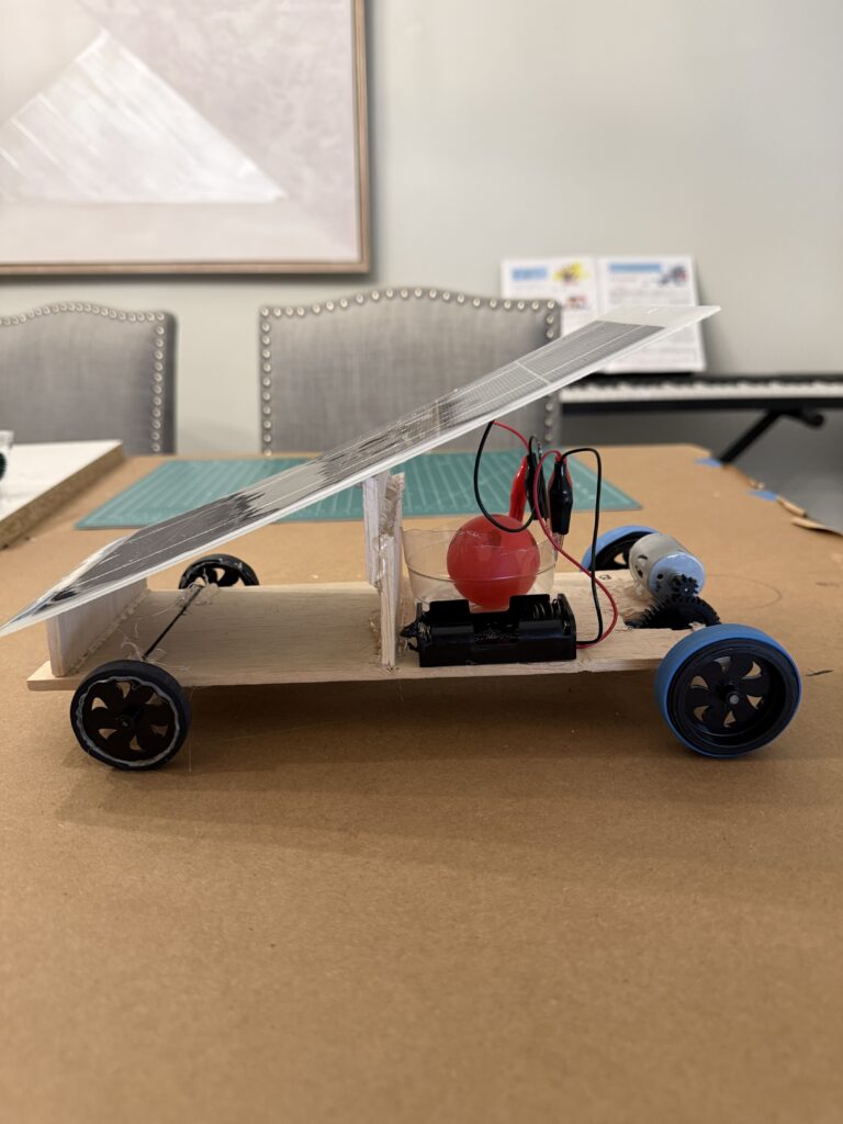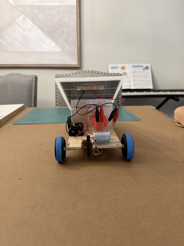 | Improvement Ideas | Change the gear on the axle to help with more power and not as much speed. | Attach back eyelet back to car | None | Bigger angle for solar panel, align string with sun. | Bigger angle for solar panel. |