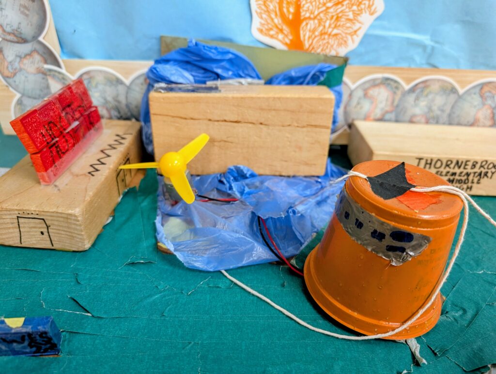 The hydroelectric dam is made from a variety of materials including a blue, plastic bag for the water, a wooden block for the dam, and a DC motor for the generator. The step-up station is made from a cup painted orange with string running from it to represent the powerlines. If a city is built near a river, hydroelectricity is an excellent renewable energy source.