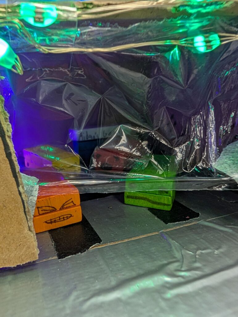 It is really fun to look inside the garage at the cars. The LED lights shine on the silly faces we drew on the front of the dominoes.