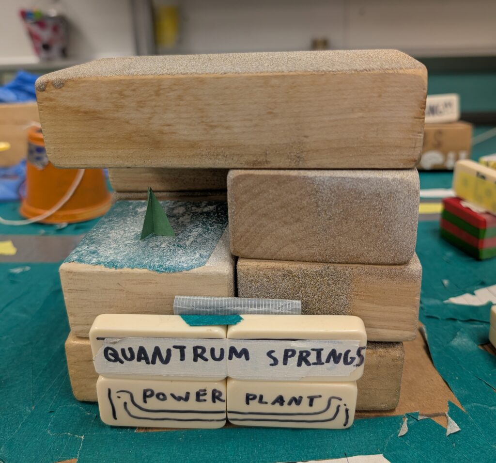 The power plant is made from wooden blocks, and the sign is made from dominoes. Power for the entire city is made here.